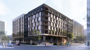 The building combines five stories of Type IIIA wood framing over a cast-in-place, post-tensioned concrete podium containing parking and two landscaped courtyards. This hybrid system places durable concrete where loads are greatest and uses wood framing above for efficient, cost-effective construction. HDS Architecture’s L-shaped plan encloses the courtyards, bringing daylight into the buildings interior. Brick, fiber-cement panels, and glass maintain a neighborhood scale with a contemporary expression.