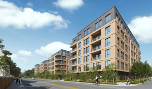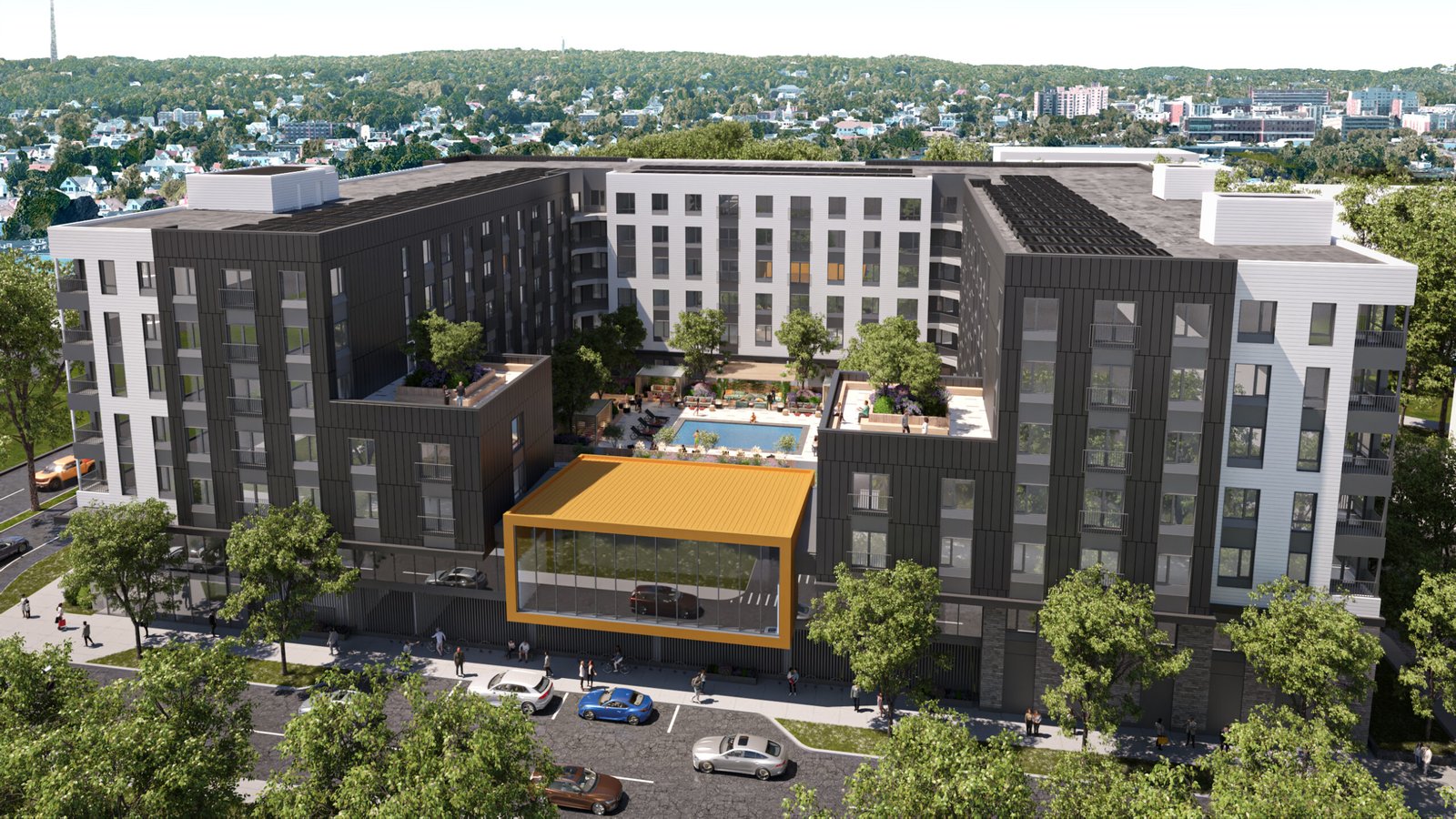 Planned as a Passive House building, the project applies performance goals to its overall energy approach while organizing resident amenities within a glass “jewel box” volume that houses fitness and shared spaces, complemented by outdoor patios and a pool area.