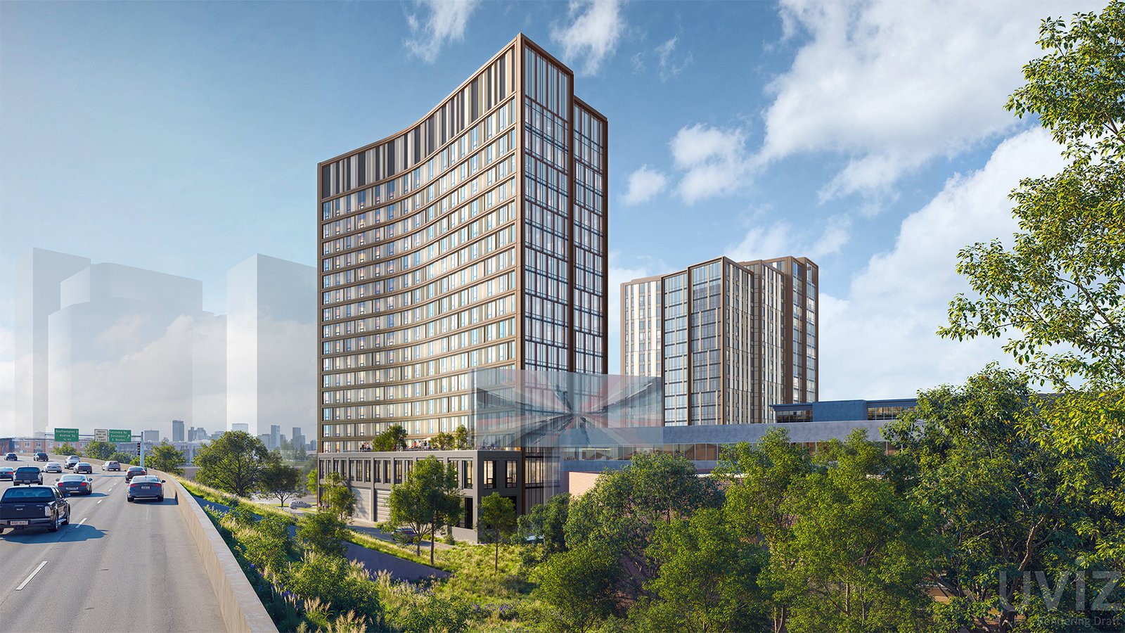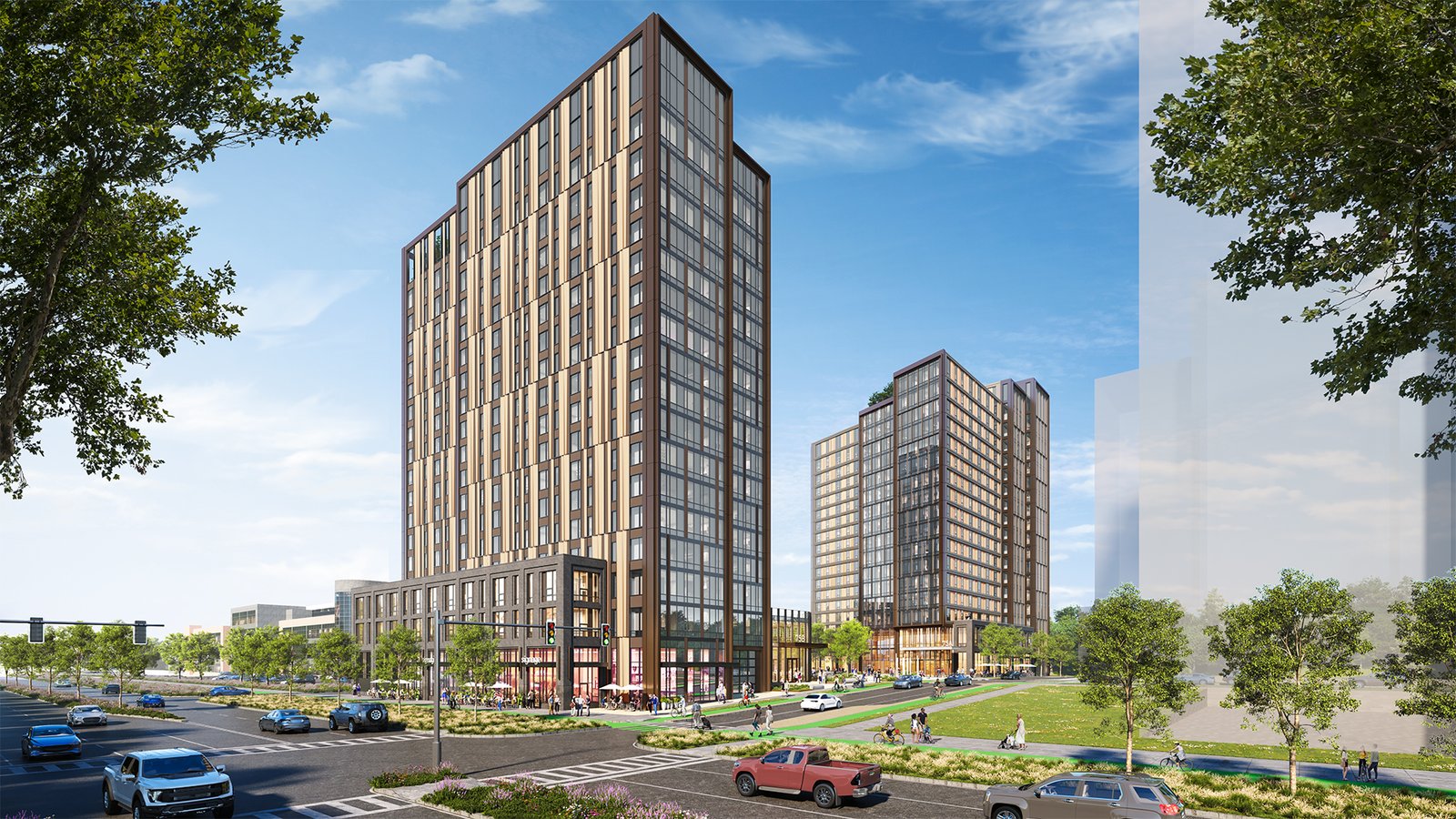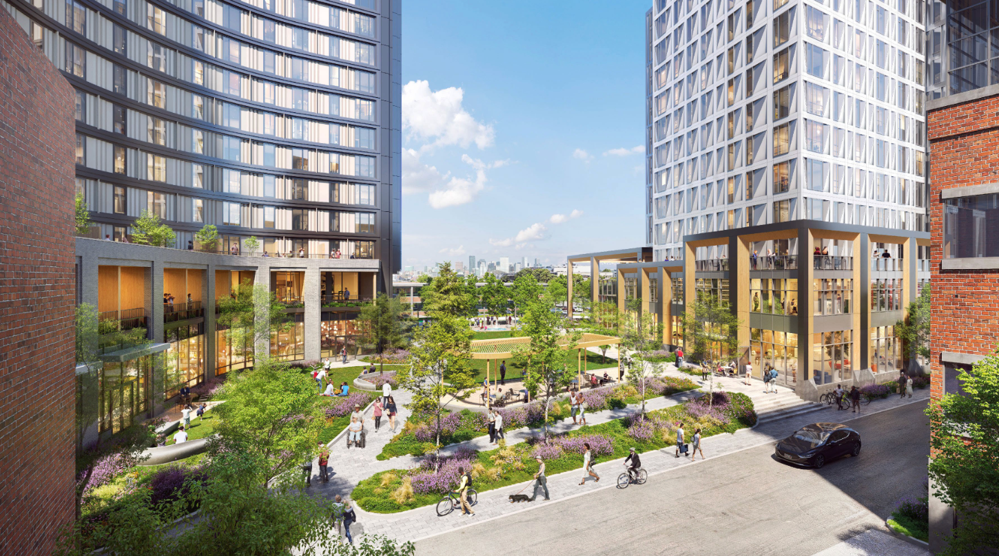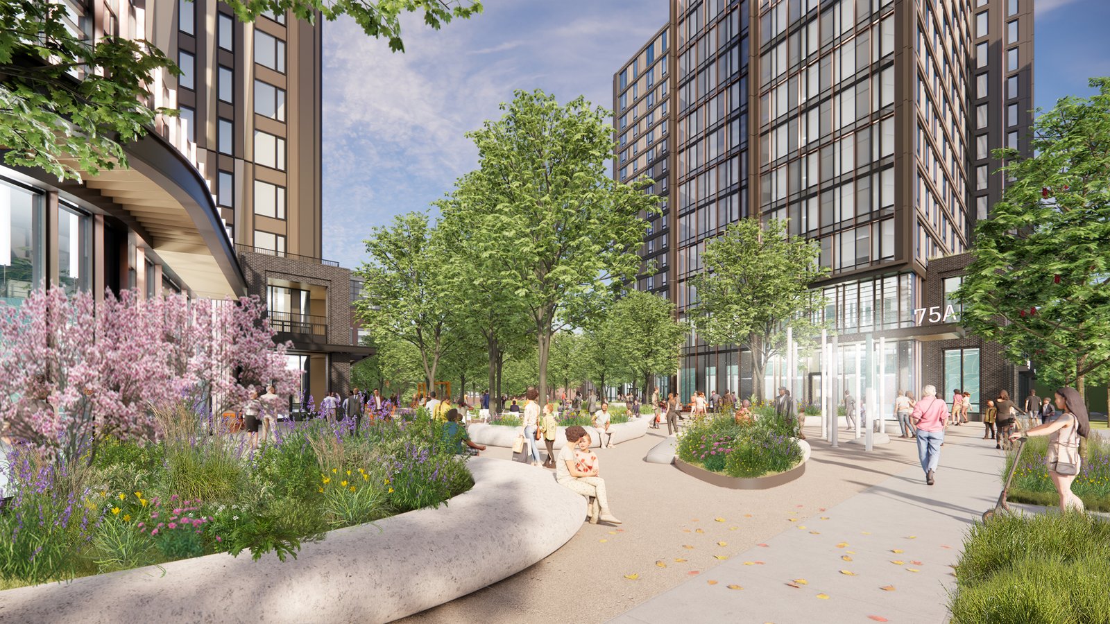 Phase I represents that shift with two 18-story towers rising at 75 Morrissey Boulevard, delivering 754 apartments—20% of which, about 150 units, are designated as affordable. The plan also includes a new 23,900 square-foot community park anchoring the towers, along with civic and retail spaces designed to activate the ground plane and connect with the neighborhood.